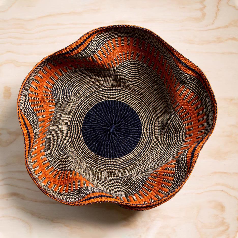 The African Royal Wave Bolga Basket is a vibrant and functional work of art, handcrafted by the indigenous Gurune people of Bolgatanga—the craft hub of Ghana. Traditionally used as colanders for separating millet from water, these baskets showcase exceptional weaving techniques passed down through generations.