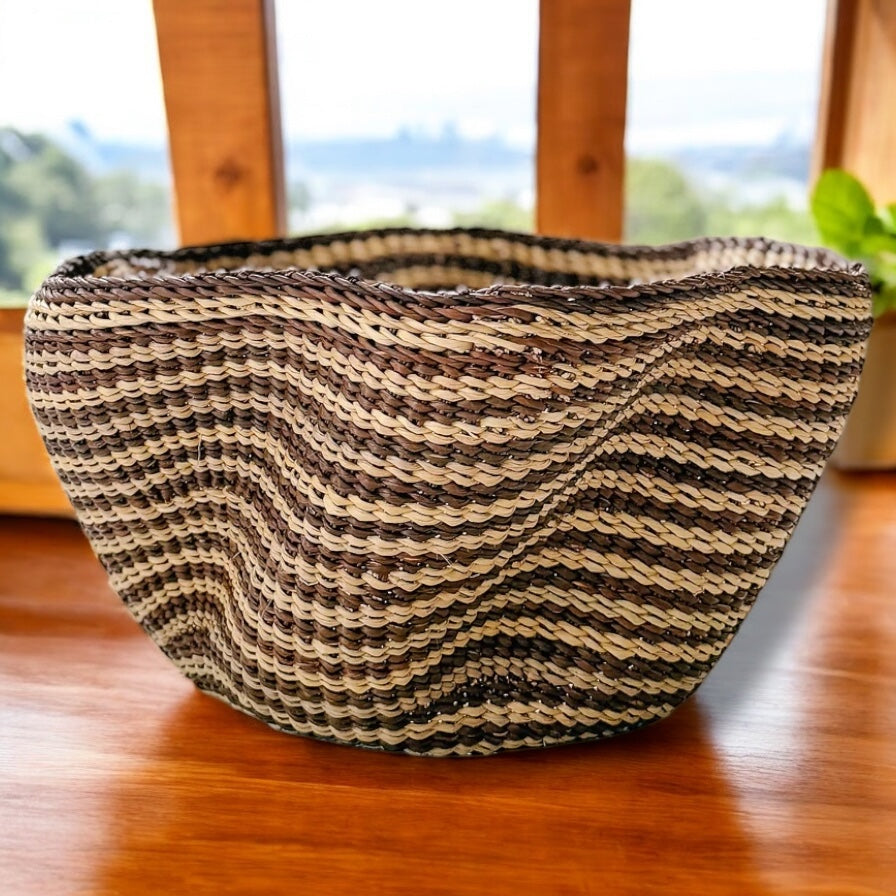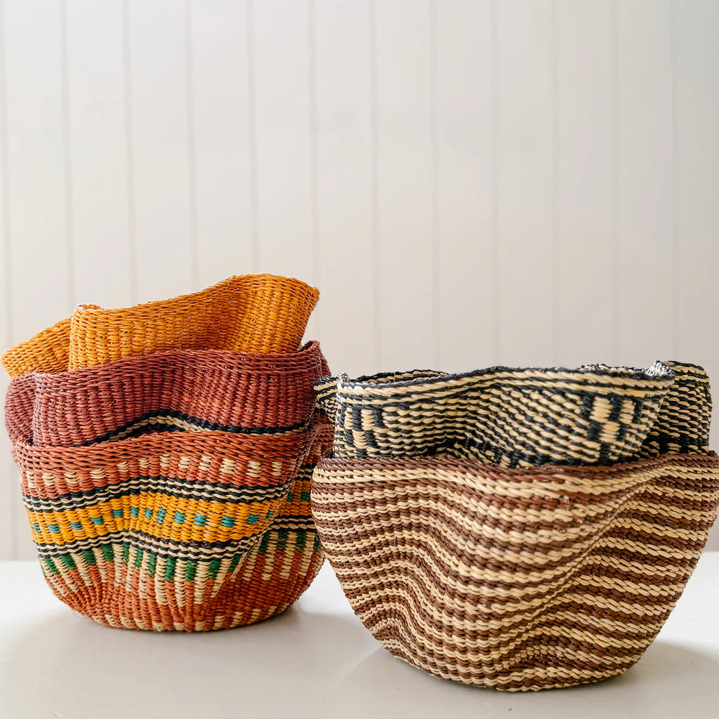 The wave Bolga Basket is a vibrant and functional work of art, handcrafted by the indigenous Gurune people of Bolgatanga—the craft hub of Ghana. Traditionally used as colanders for separating millet from water, these baskets showcase exceptional weaving techniques passed down through generations.