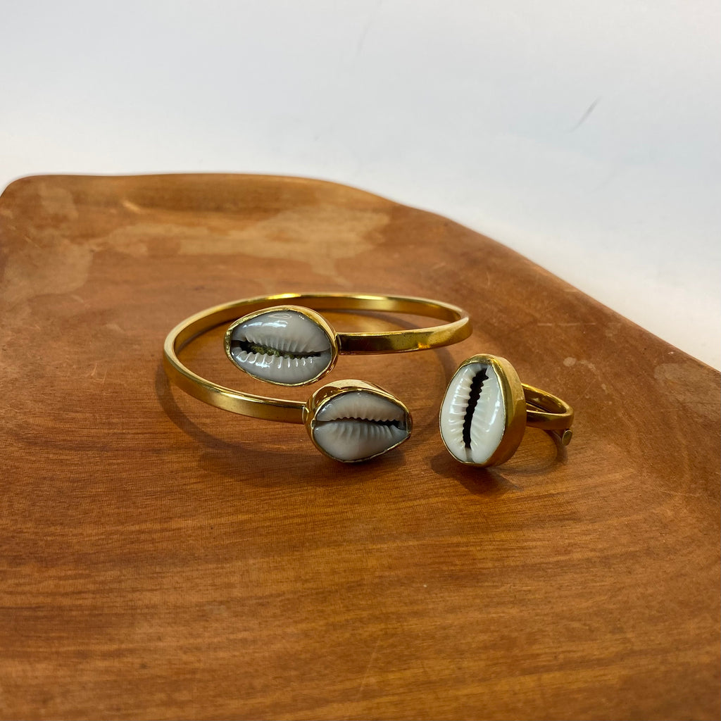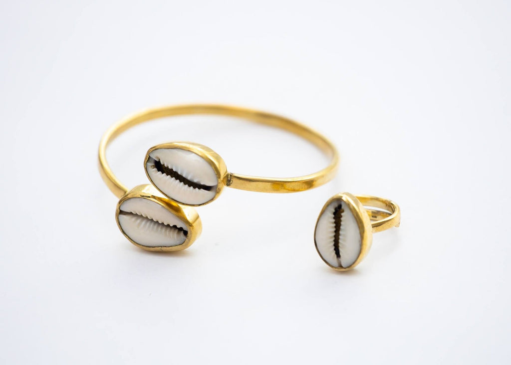 Made in collaboration with a community of talented artisans and creatives from Africa who represent the continent’s diversity and potential. The funa jewelry handmade by talented artisans in Africa, is a classic piece of a natural cowrie shell adjustable bangle and adjustable cowrie brass ring. Every Safi purchase provides free skill training, consistent employment, and resources for artisans through the Safi craft kit web app.