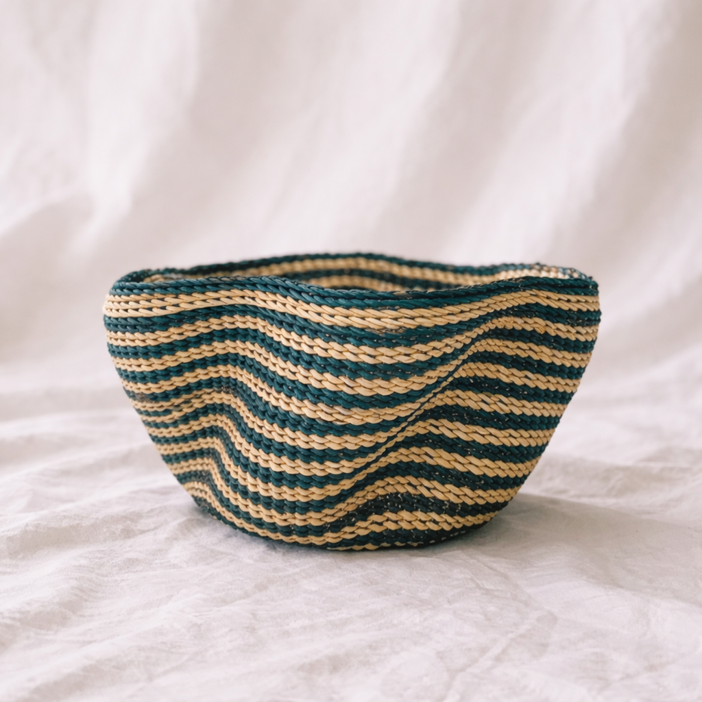 The wave Bolga Basket is a vibrant and functional work of art, handcrafted by the indigenous Gurune people of Bolgatanga—the craft hub of Ghana. Traditionally used as colanders for separating millet from water, these baskets showcase exceptional weaving techniques passed down through generations.