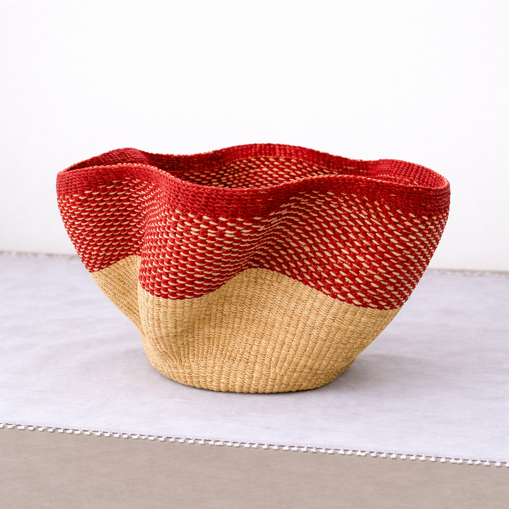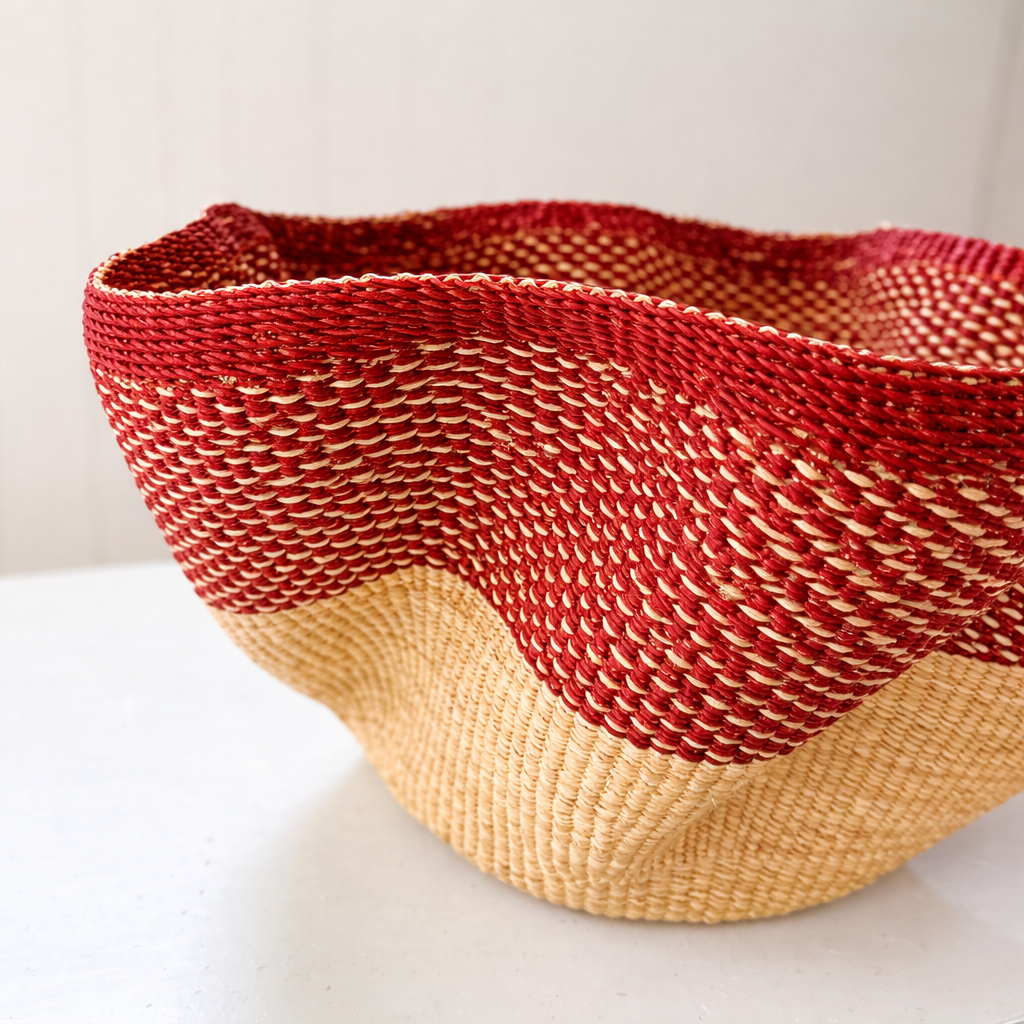 The wave Bolga Basket is a vibrant and functional work of art, handcrafted by the indigenous Gurune people of Bolgatanga—the craft hub of Ghana. Traditionally used as colanders for separating millet from water, these baskets showcase exceptional weaving techniques passed down through generations.
